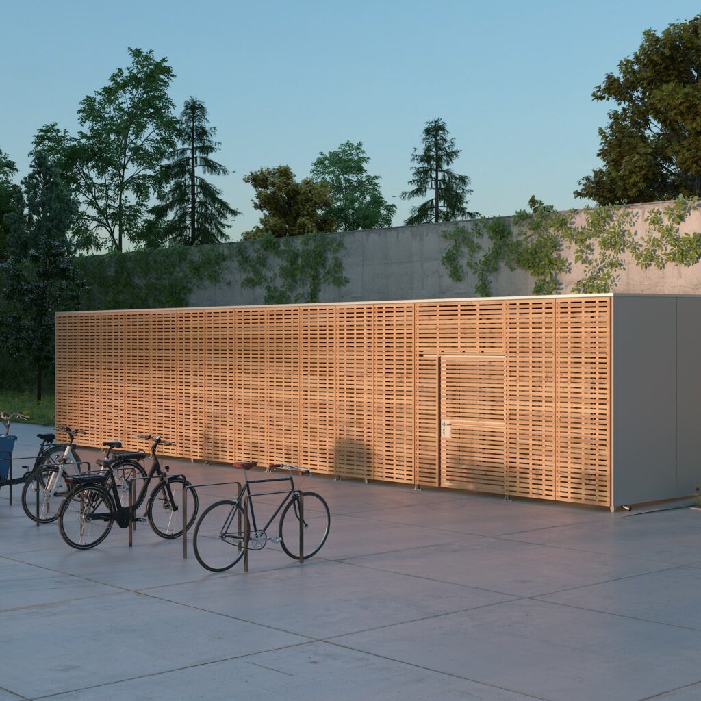 Unsere Fahrradgaragen mit Holz-Fassadenpaneelen fügen sich harmonisch in jede Wohnanlage und in jedes Büro- oder Gewerbeumfeld ein. Egal, ob freistehend in einer Grünfläche oder als Anbau an ein bestehendes Gebäude – durch den natürlichen Baustoff Holz und die vielfältigen Möglichkeiten der Individualisierung (wie z. B. das begrünte Dach) erhält unsere Fahrradgarage Holz stets ein angenehmes und maßstäbliches äußeres Erscheinungsbild.