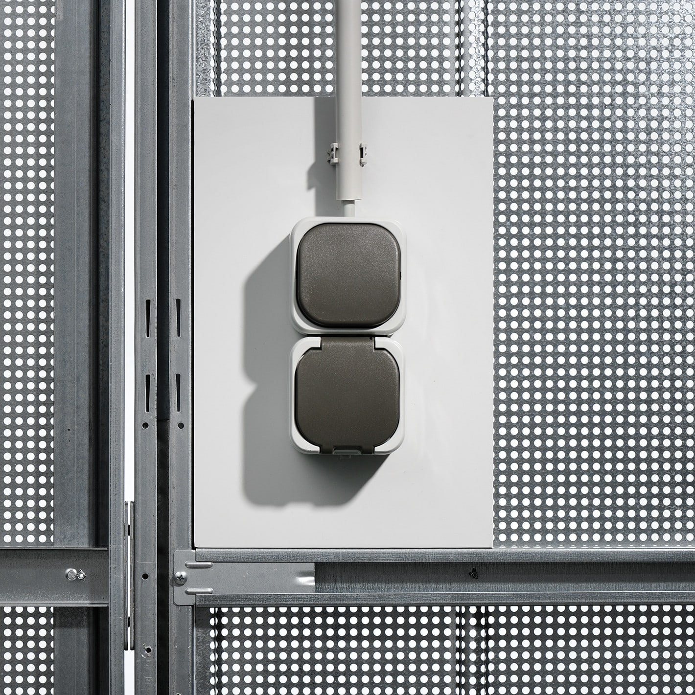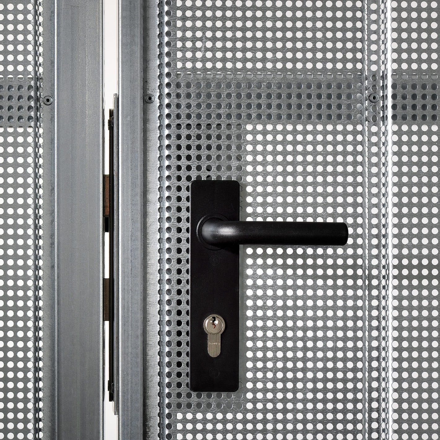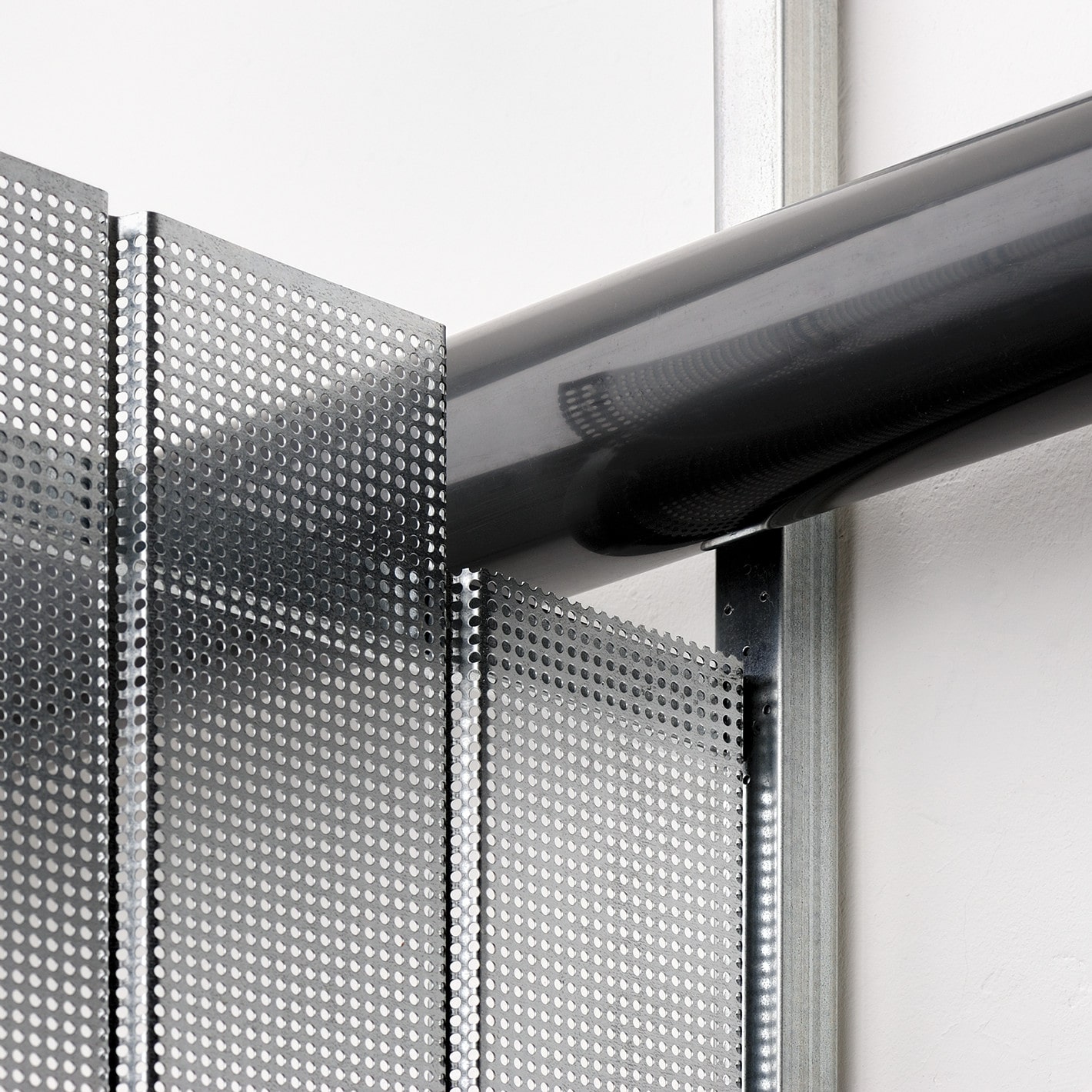 Wandelemente aus verzinktem Stahllochblech mit geraden Lochreihen (Rg 5/8) sorgen für eine dezente Transparenz und moderne Optik. Das Lochblech schützt vor Blicken und ungewolltem Durchgreifen, während es zugleich einen optimalen Luftaustausch sicherstellt. Dank der senkrechten Sickung des 1 mm starken Blechs erreicht die Konstruktion eine hohe Stabilität.